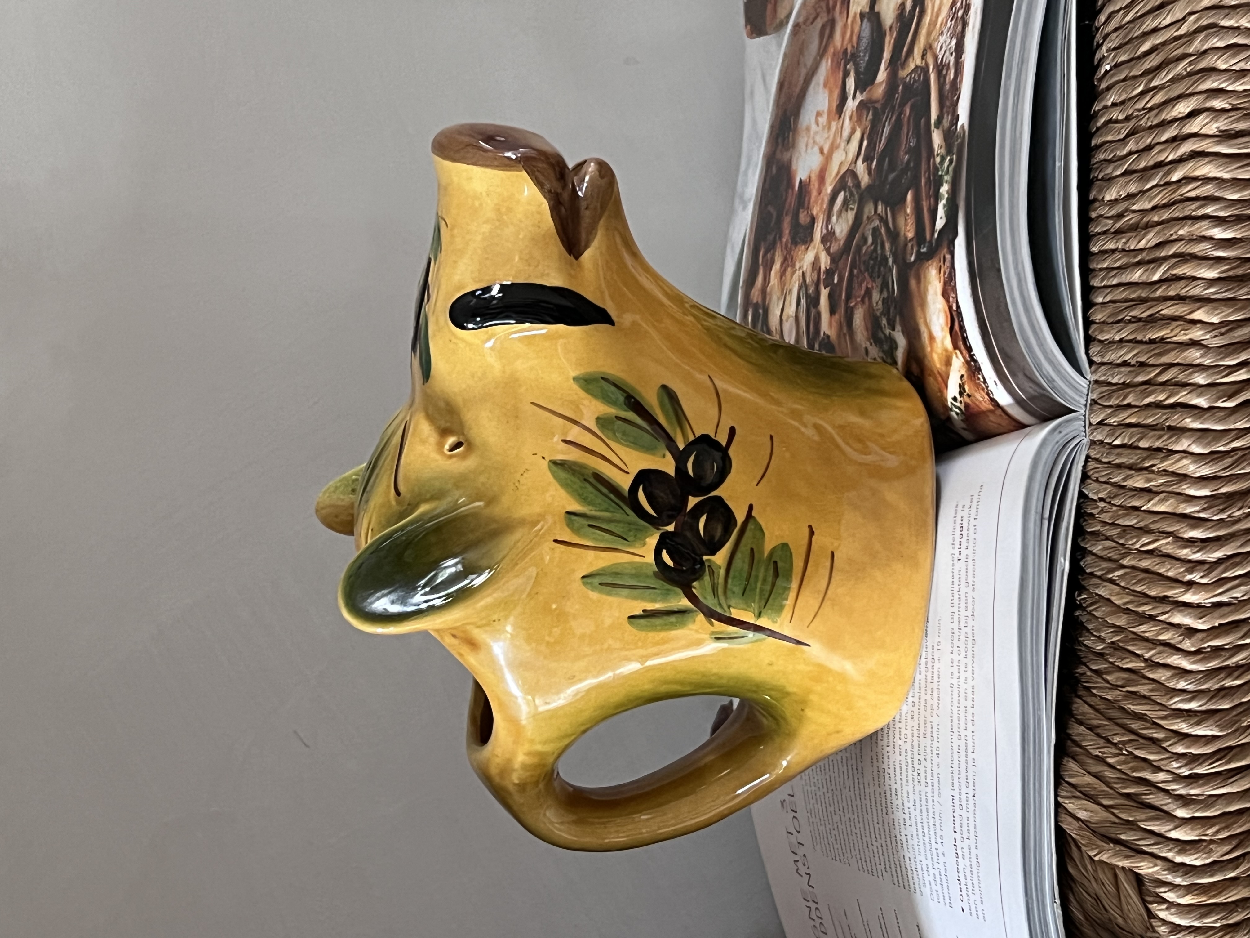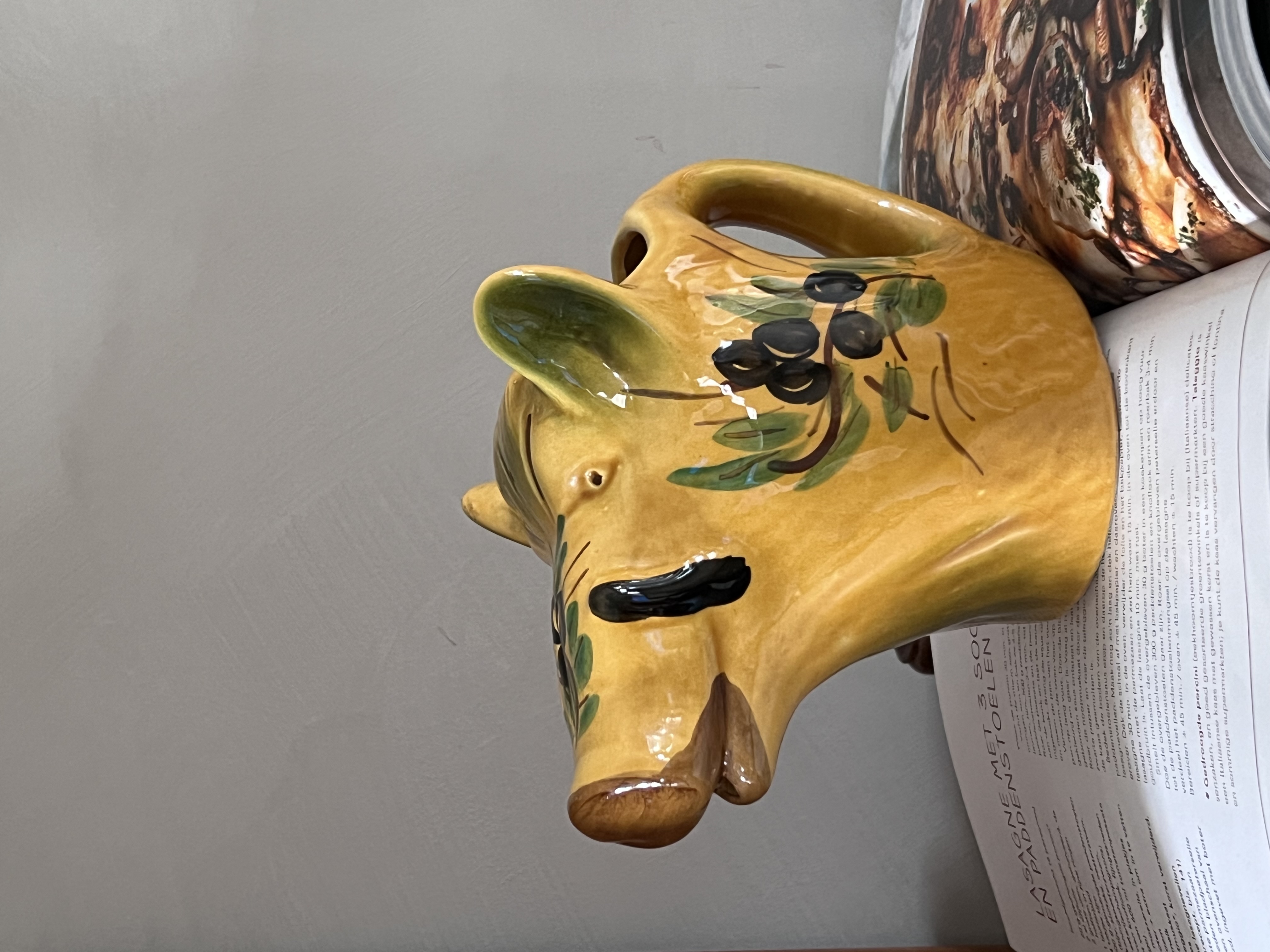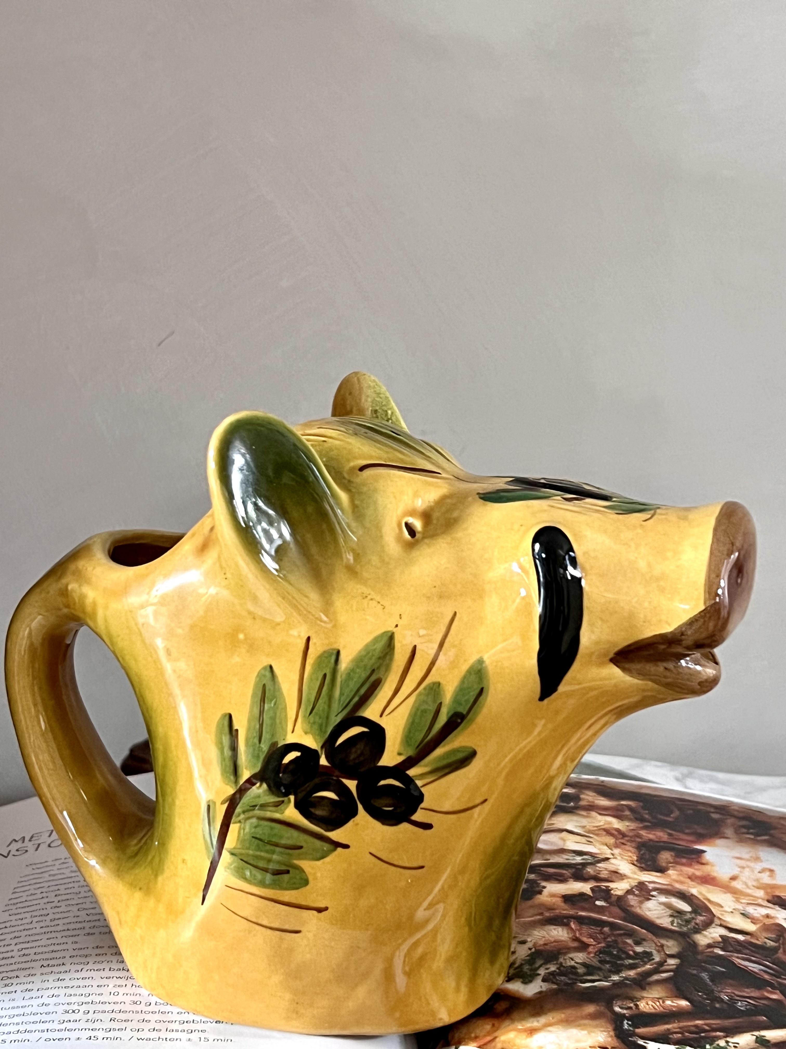 Dit is een keramische kan in de vorm van een varken, vaak gebruikt als waterkan of wijnkan, en kenmerkend voor de Zuid-Franse aardewerktraditie, met name uit Vallauris. Het varken is een veelvoorkomend motief in de Provençaalse keramiek, en de olijftakken die erop geschilderd zijn, benadrukken de mediterrane oorsprong.