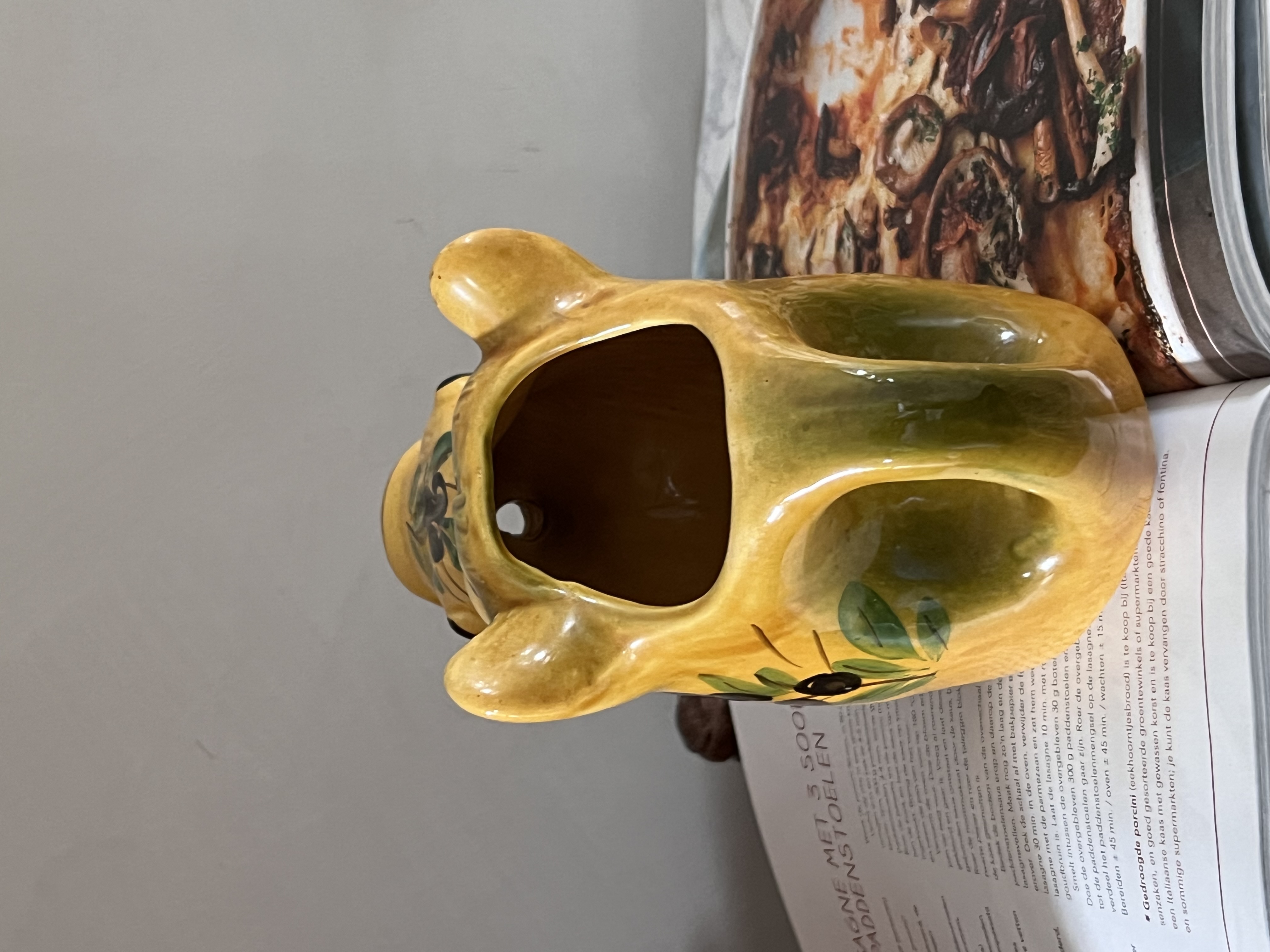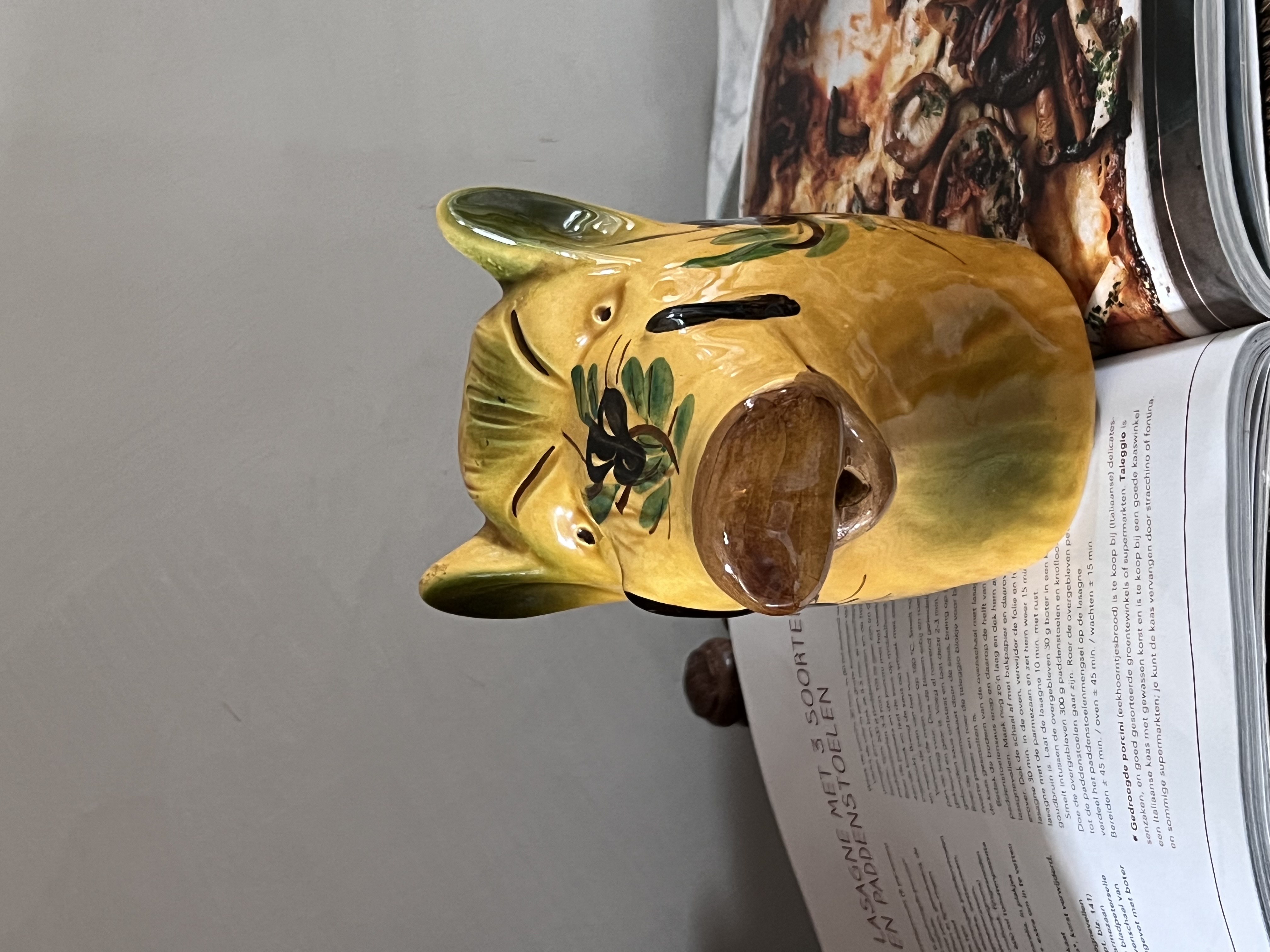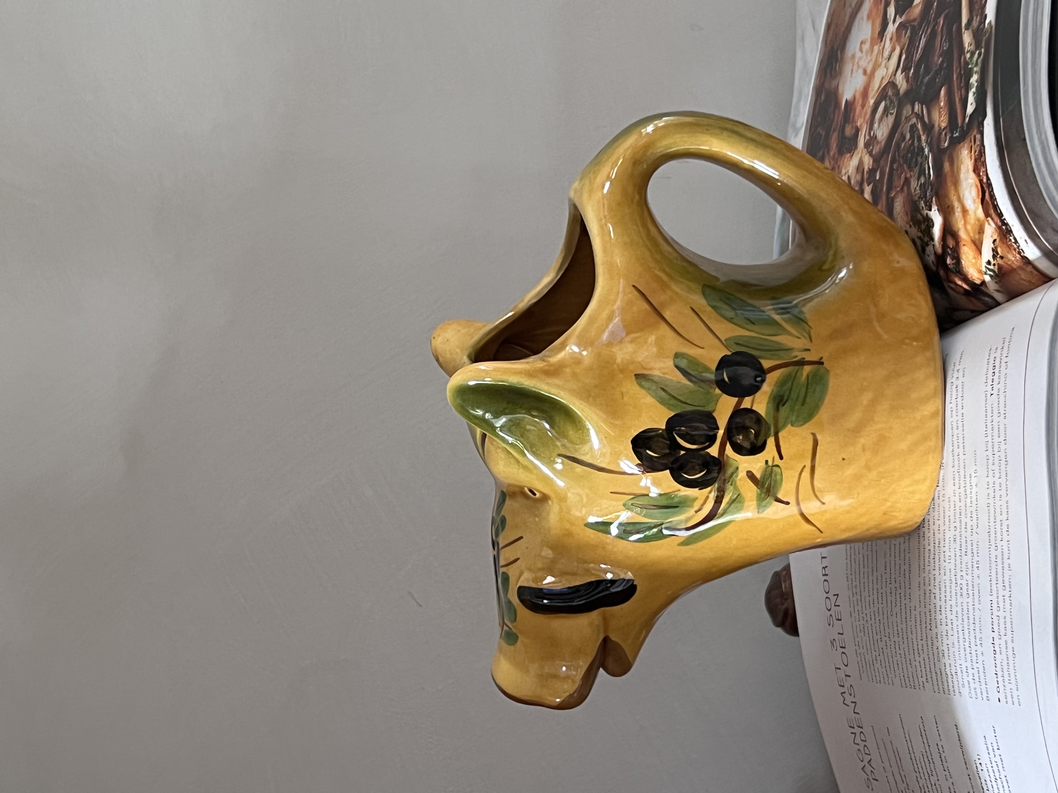Dit is een keramische kan in de vorm van een varken, vaak gebruikt als waterkan of wijnkan, en kenmerkend voor de Zuid-Franse aardewerktraditie, met name uit Vallauris. Het varken is een veelvoorkomend motief in de Provençaalse keramiek, en de olijftakken die erop geschilderd zijn, benadrukken de mediterrane oorsprong.