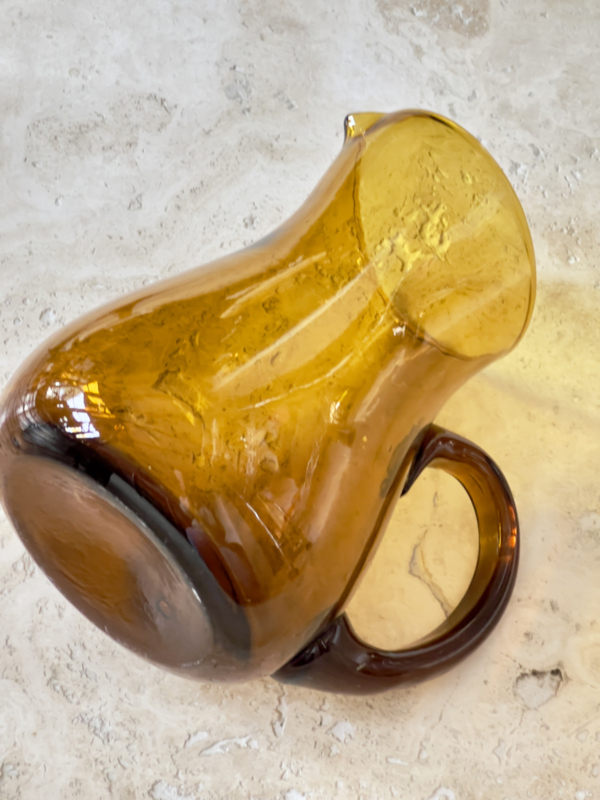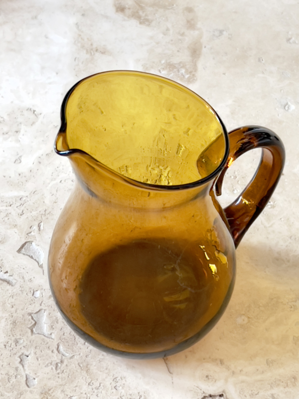 Dit is een amberkleurige glazen kan, ook wel bekend als een Spaanse sangriakan.