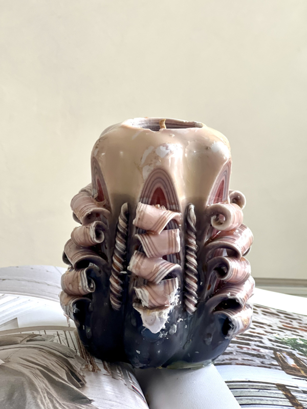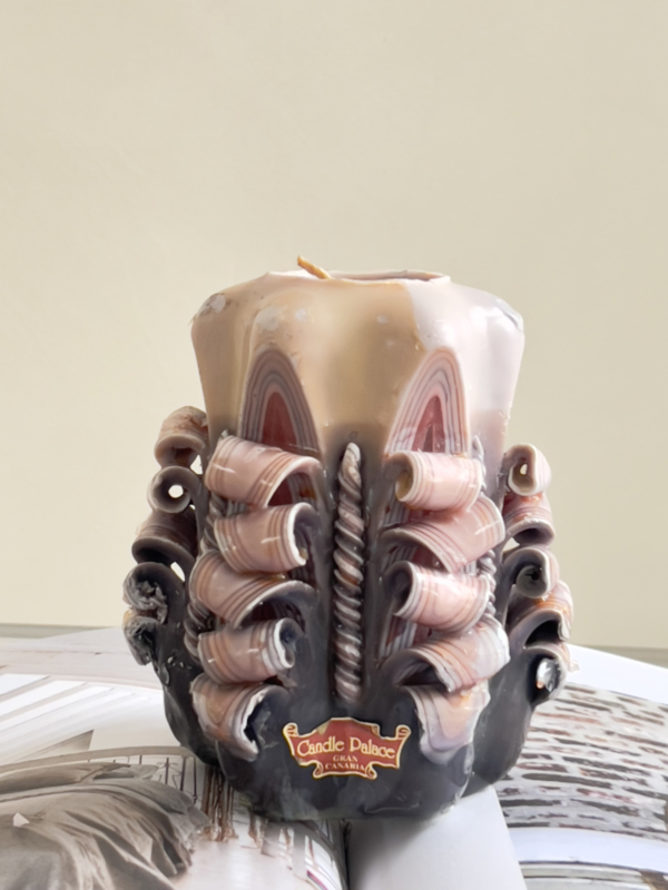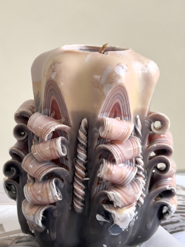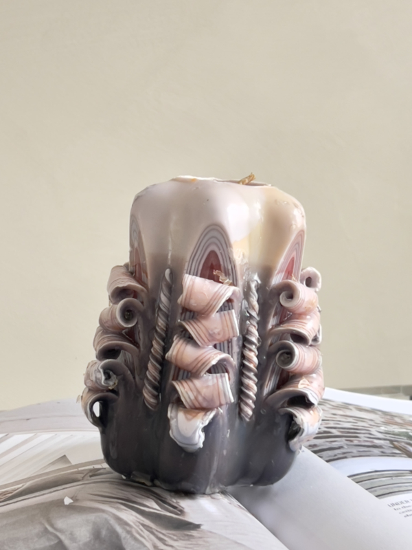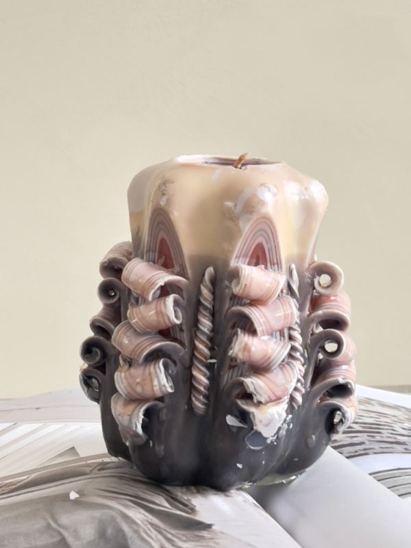 handgesneden kaars, ook wel snijkaars genoemd. Deze kaarsen zijn een vorm van ambachtelijk handwerk waarbij gespecialiseerde technieken worden gebruikt om ingewikkelde patronen en vormen uit gekleurde paraffine of was te snijden.