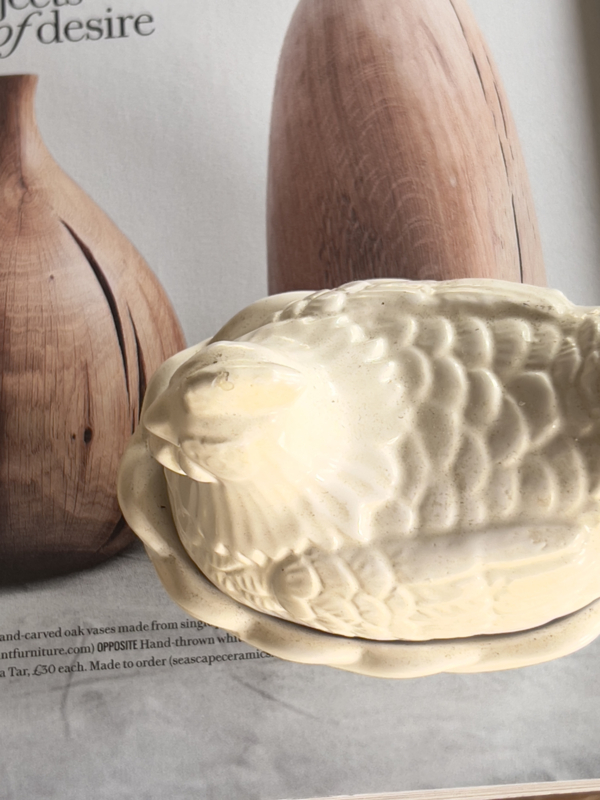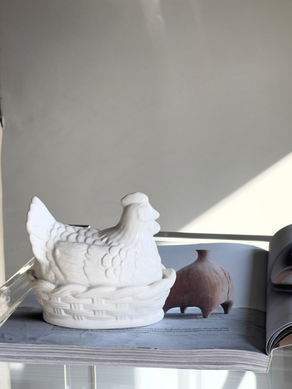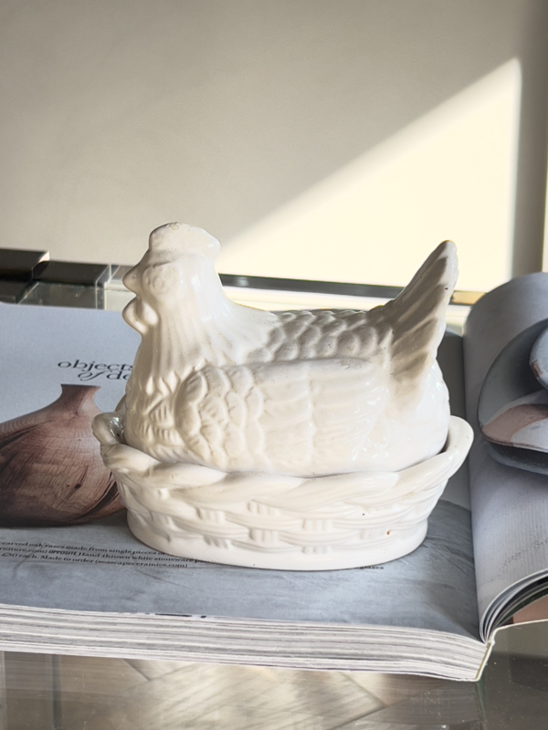 Vintage wit keramisch aardewerk gedetailleerd kipje op nest. Mooi voor de aankomende paasdagen.