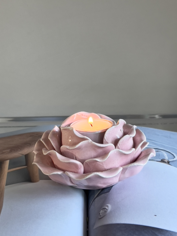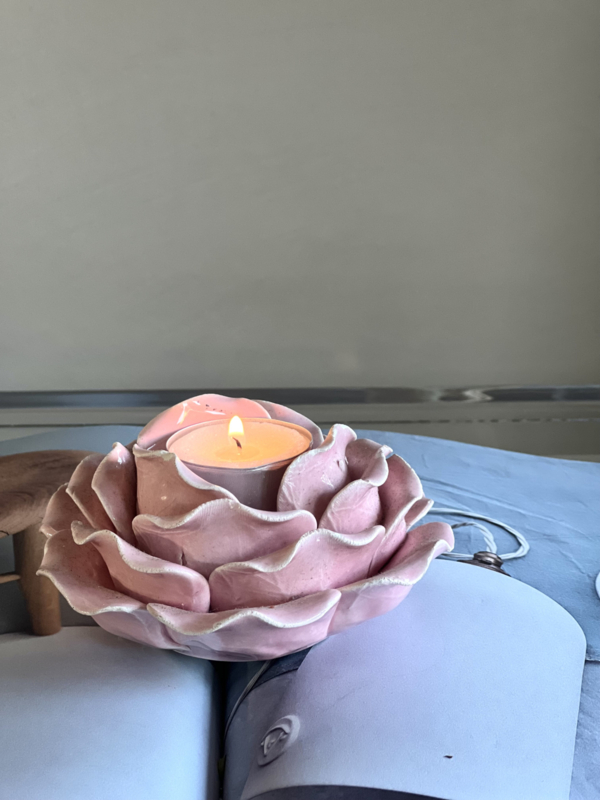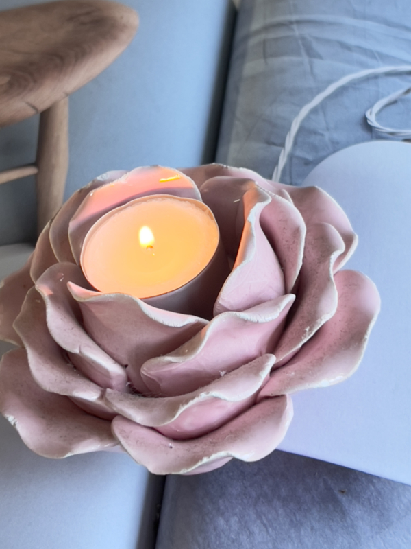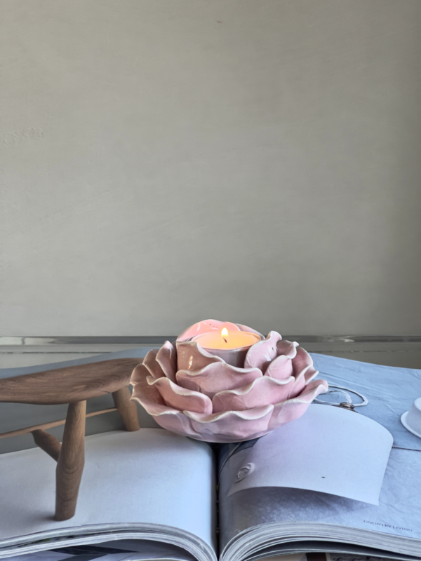 Keramiek. In lief rose. Prachtige roos. Mooi op de koffietafel. Heeft enkele kleine plekjes door de tand des tijds; zie foto's.