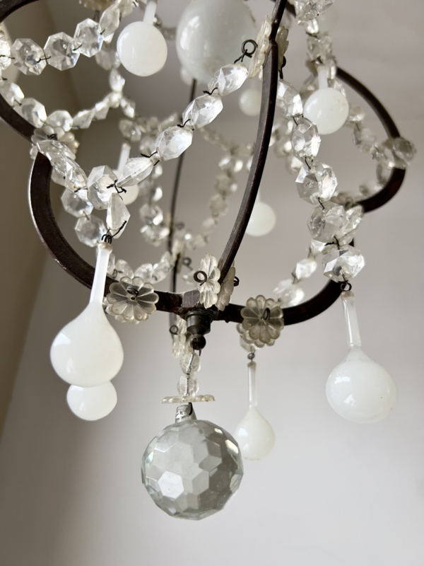 The chandelier in the image is a crystal chandelier with a dark metal (possibly wrought iron or bronze-colored) frame, often referred to as a vintage or French-style chandelier. This type of lighting combines the elegance of crystal beads and pendants with a rustic, dark frame. Key Features Style: The style leans toward antique, country, or vintage design, popular in French interiors. Materials: The frame is made of dark metal, while the decorations consist of transparent glass or crystal beads and teardrop-shaped pendants. Design: The chandelier has an open, cage-like or "birdcage" design with graceful, rounded arches. The light sources (here, modern bulbs) are visibly mounted. Application: Such lamps are often used to add a touch of classic elegance and charm to living rooms, dining rooms, or bedrooms.