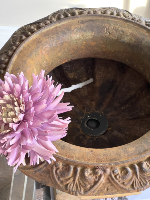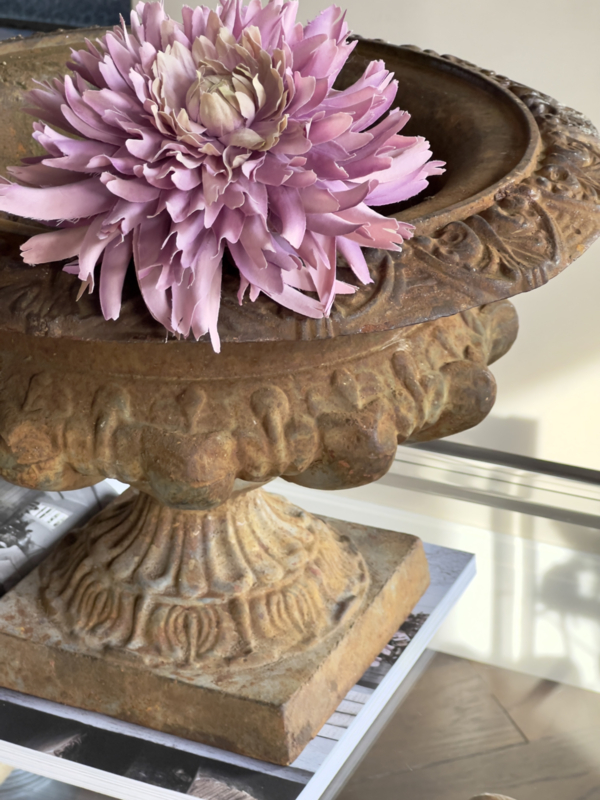This is a classic French-style cast iron garden vase with an antique look. It's a beautiful, large piece. Not an antique, but a vintage piece in antique style. Beautiful on the garden table or patio.