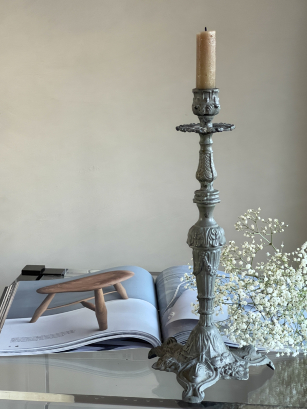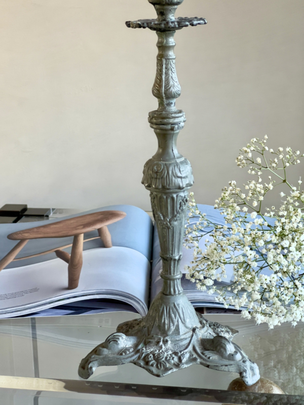 The candlestick is composed of several parts (the parts are movable relative to the axis). The base is richly decorated with, among other things, roses that support the beautiful structure. The column is decorated with floral motifs in the Empire style. The candlestick is separated by a thin rosette, which itself repeats the overall floral motif. Made of a zinc alloy that was very popular around the turn of the 19th century for the production of large and small works of art and which strongly resembles lead in appearance. A beautiful object on the coffee or dining table with a dinner candle inside. A stylish and timeless classic piece.