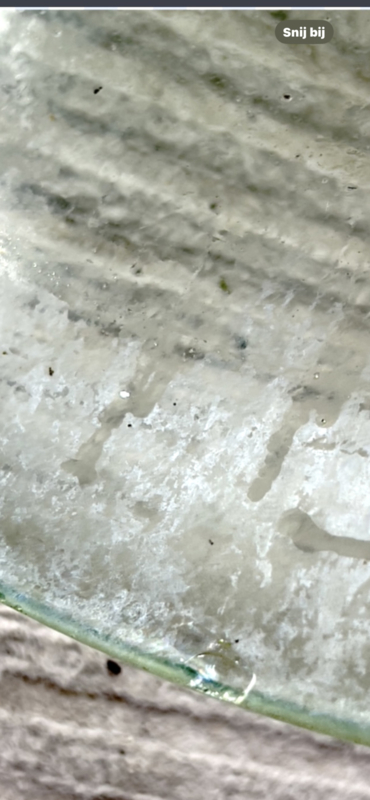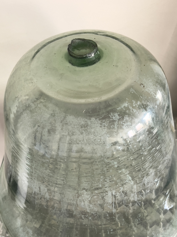 This image shows an antique French glass dome, also known as a cloche de melon or garden dome. Use: Originally used in vegetable gardens to protect young plants from frost and to function as a mini-greenhouse. Material and Color: Made of glass with a characteristic water-green color. Feature: This example has a cut-off knob, which was common because it made stacking the cloches easier. They were also sometimes cut off during glassblowing.